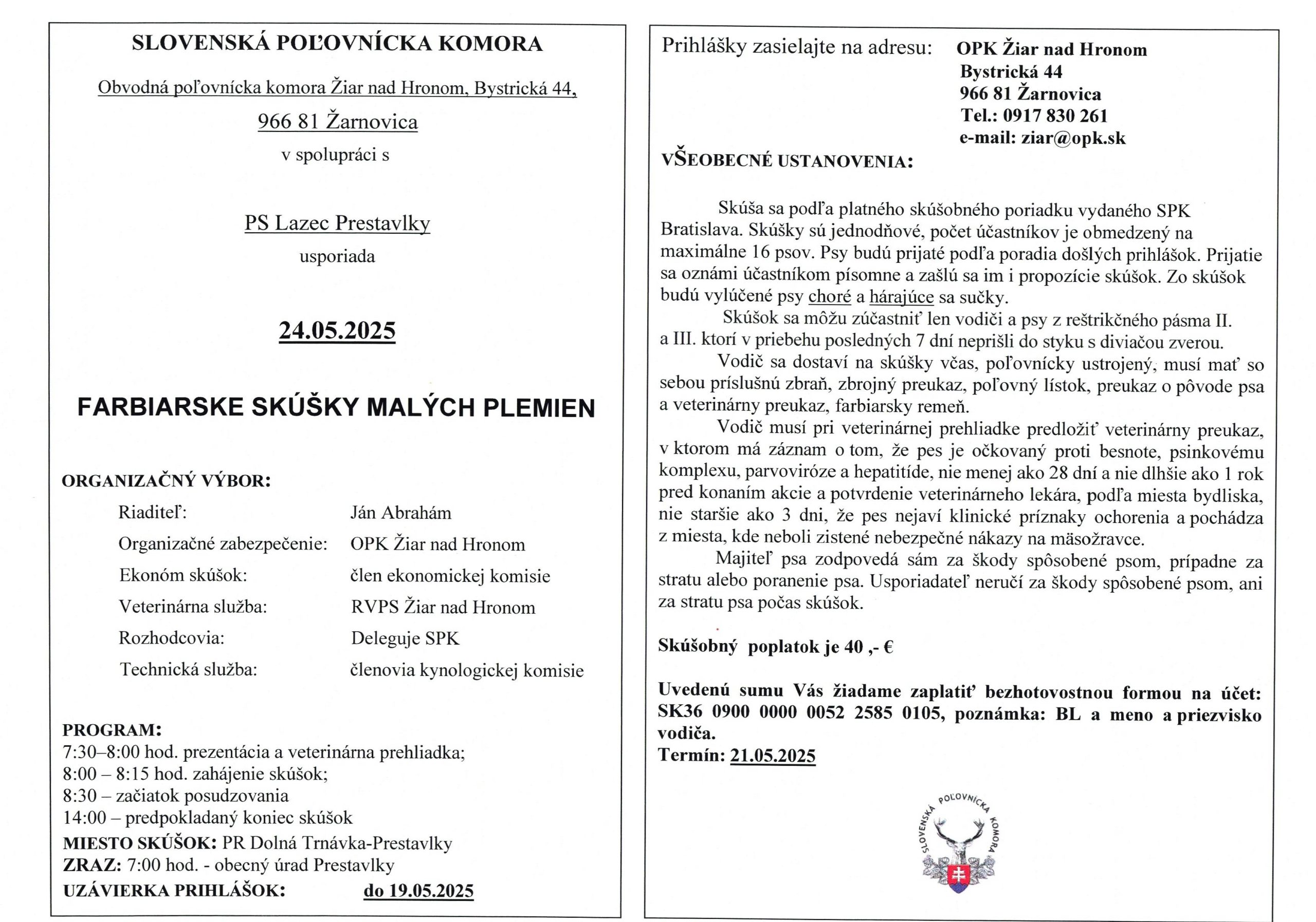 Dňa 8. novembra 2025 usporiadala Obvodná poľovnícka komora Žiar nad Hronom v spolupráci s Poľovnou spoločnosťou Kľakovská dolina v poľovnom revíri Píla predbežné skúšky farbiarov. Na skúškach sa zúčastnilo trinásť psov z toho dva hanoverské farbiare, dva bavorské farbiare, tri štajerské duriče, tri alpské jazvečíkovité duriče, dva tatranské duriče a jeden slovenský kopov. Počas celého trvania skúšok sťažoval prácu psov vytrvalý dážď. V náročných podmienkach zo zúčastnených psov a ich vodičov v skúške obstálo sedem v l.cene, tri v lll. cene a tri v skúške neobstáli. Víťazom skúšok sa stala bavorská farbiarka VLARA Devana s vodičom Jánom Mečiarom s počtom bodov 200. Úspešní absolventi skúšok získali poľovnú upotrebiteľnosť na dohľadávanie jelenej, danielej a muflonej zveri. Gratulujeme.